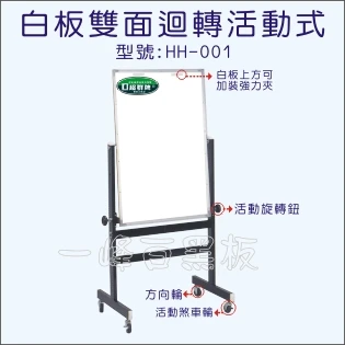 ◆白板(雙面迴轉式)HH-001 功能(一):可夾數張海報或簡報利於教學翻閱 功能(二):雙面白板方便一面書寫保留,翻轉 另一面可繼續書寫 功能(三):附有煞車輪,方便小型辦公室、 教室、戶外教學不佔